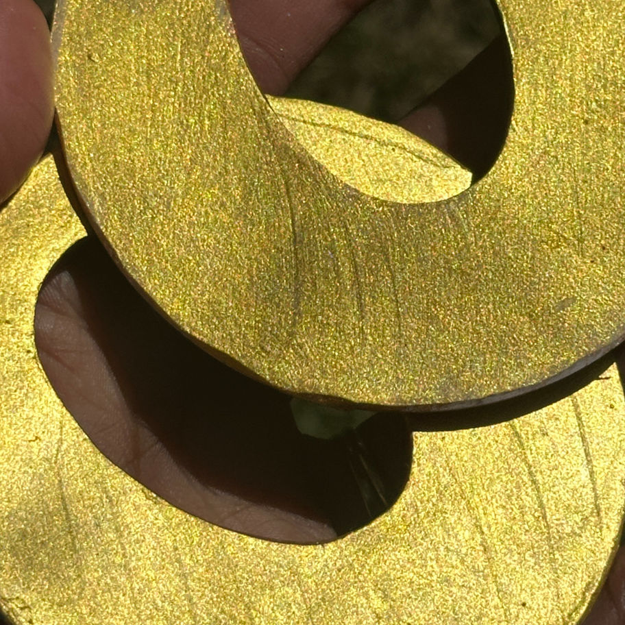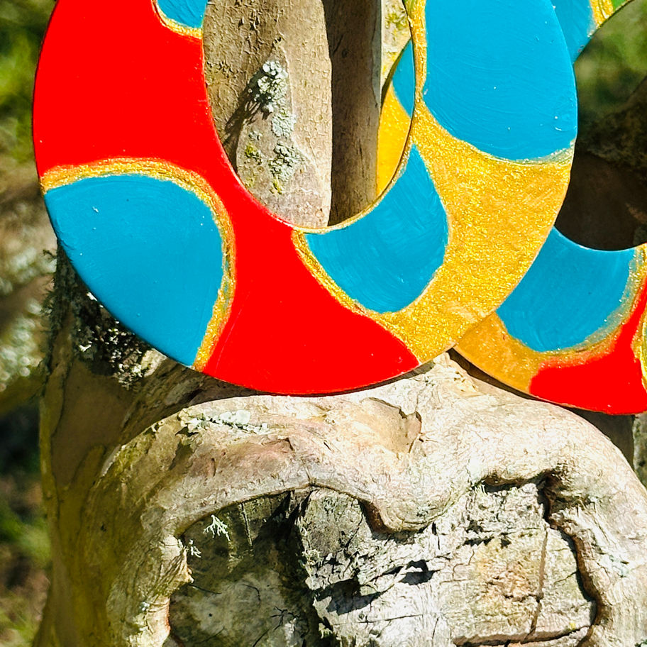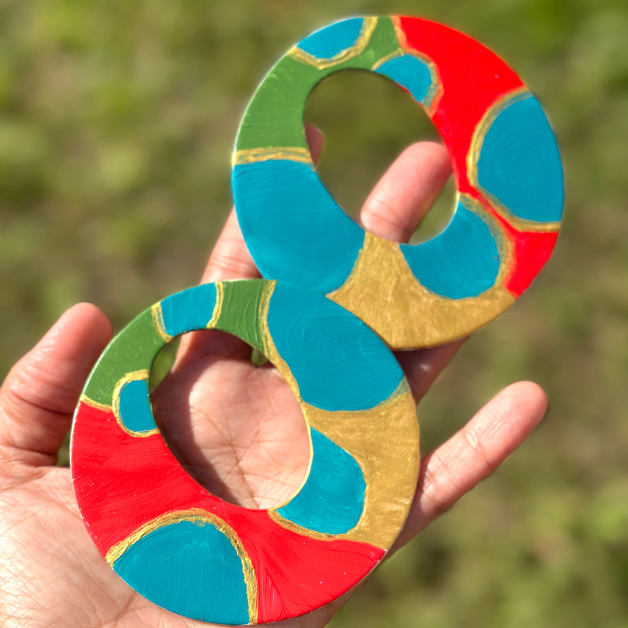 The Festival Orbit Hoops are pure joy in motion — large, hand-painted circles that celebrate rhythm, culture, and color. Swirls of turquoise, red, green, and metallic gold come together in an abstract mosaic that feels alive with movement. Each piece is individually crafted, painted by hand, and sealed for a lasting, satin finish. Bold yet airy, they’re wearable art for those who love vibrant self-expression.