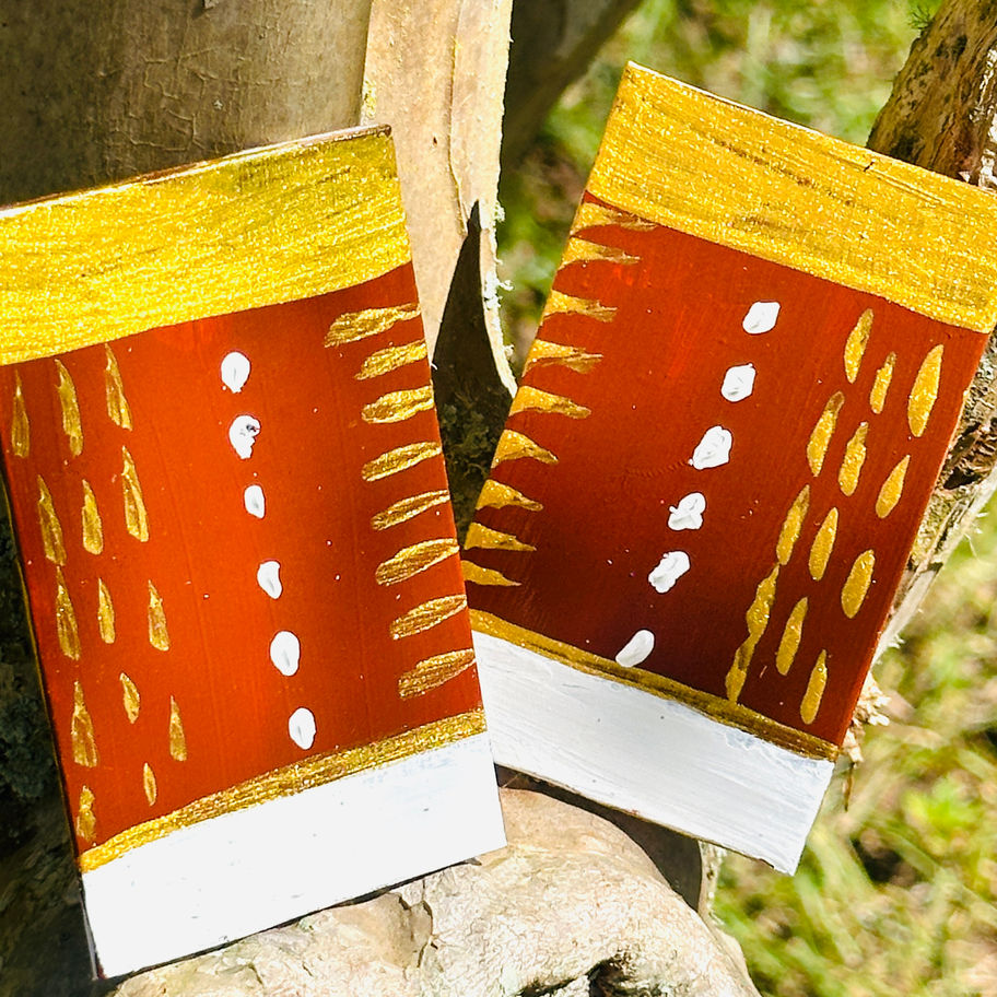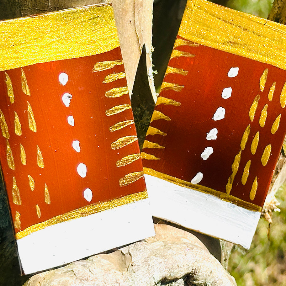 The Sahara Lines earrings draw inspiration from desert landscapes and ancient artistry. Layers of ochre, gold, and ivory come together in a hand-painted pattern that feels both grounded and radiant. Each stroke evokes sunlight over sand — minimalist, textural, and deeply organic. These statement rectangles balance earthy warmth with golden shimmer, perfect for any art-inspired look.