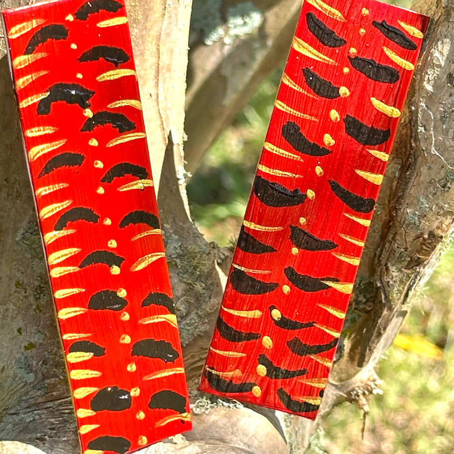 Crimson Ember Stripes channel confidence and rhythm through every brushstroke. Hand-painted in fiery red with bold black and gold markings, this pair embodies the fierce energy of self-expression. Lightweight yet visually striking, they’re designed to turn simplicity into statement — unapologetically bold, undeniably you.